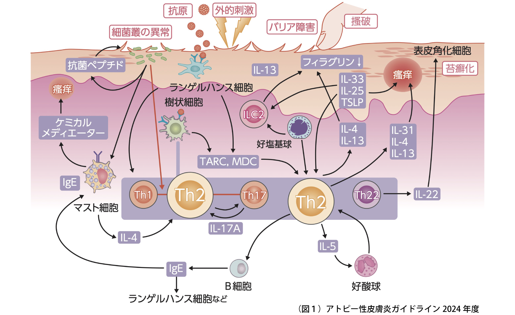 アトピー性皮膚炎(atopic dermatitis:AD)とは、皮膚角層のバリアー障害によって持続的なアレルゲンの皮膚への進入が繰り返され、最終的にアレルギー感作が成立して発症する病気と考えられています(図1)。