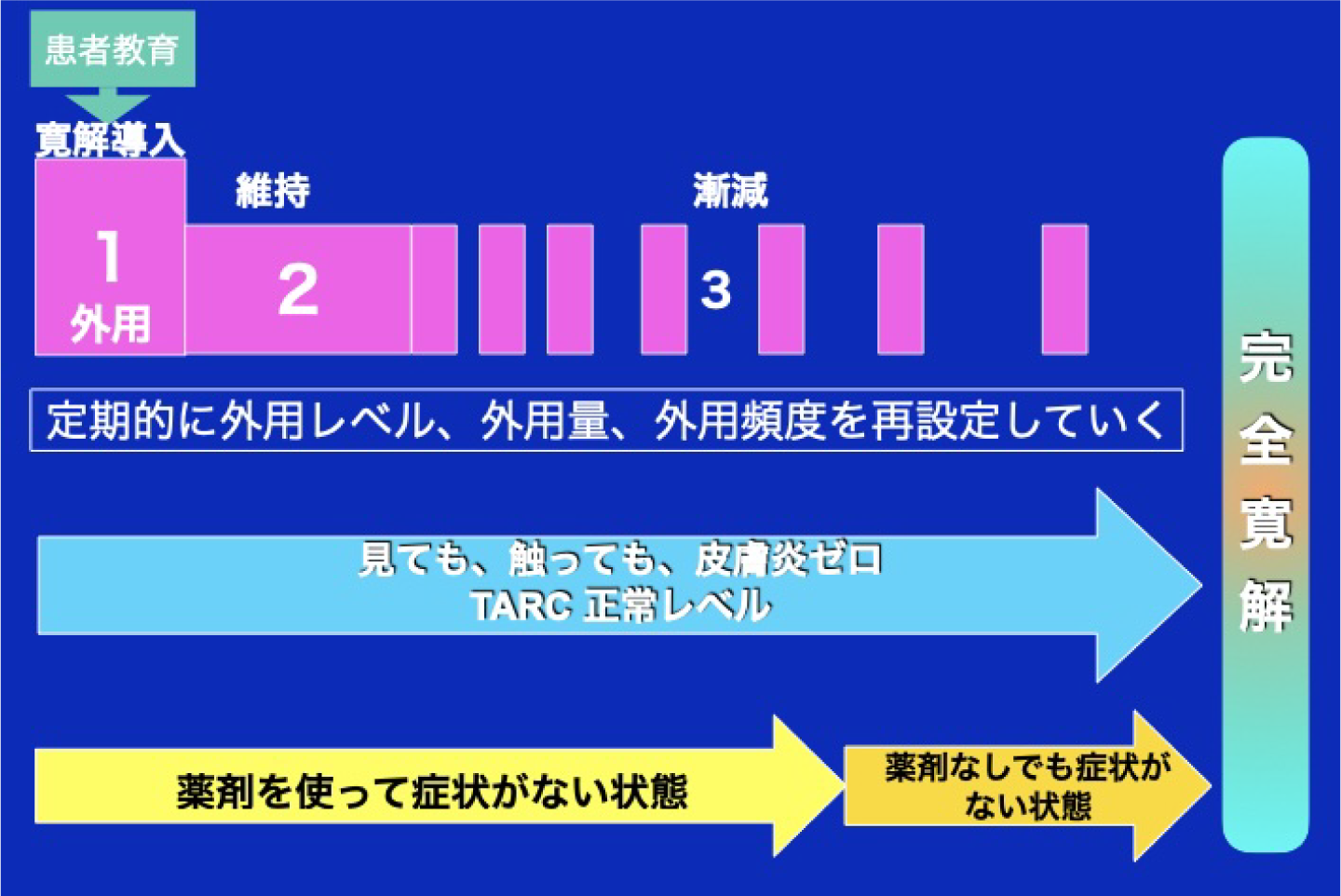 計画的に外用療法を行うことで、寛解状態に導きながら外用を漸減していく方法です。皮疹の状態や血液データより、
